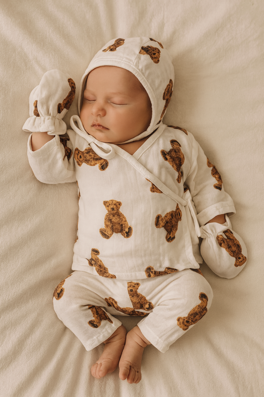 Bestaat uit een heerlijk zacht omslag vest, een broekje, een mutsje en anti krab handschoentjes. Gemaakt van 100% biologisch katoen en mousseline stof, voelt de set ultrazacht aan op de huid en. Dit setje is super makkelijk aan en uit trekken voor ouders en ook prettiger voor je baby.